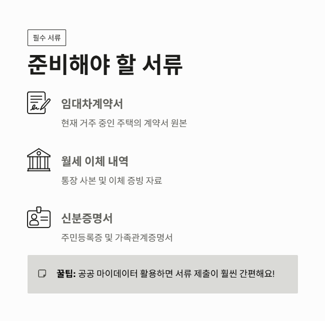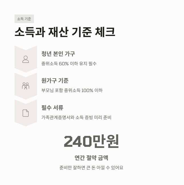 청년 본인 가구는 중위소득 60% 이하, 원가구는 100% 이하를 유지해야 하는 경우가 많으니 미리 가족관계증명서와 소득 증빙 서류를 준비해 두시는 것이 좋습니다. 준비만 잘하면 연간 240만 원이라는 큰 돈을 아낄 수 있거든요.