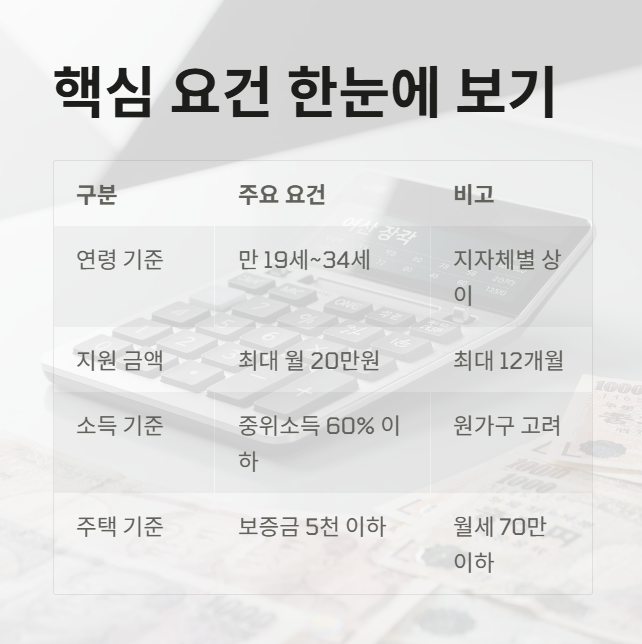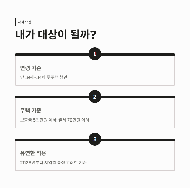 보증금 5천만 원 이하, 월세 70만 원 이하라는 기준이 일반적이지만, 2026년부터는 지역별 특성을 고려한 유연한 기준이 적용될 가능성이 높습니다. 아래 표를 통해 핵심 요건을 한눈에 비교해 보시죠.